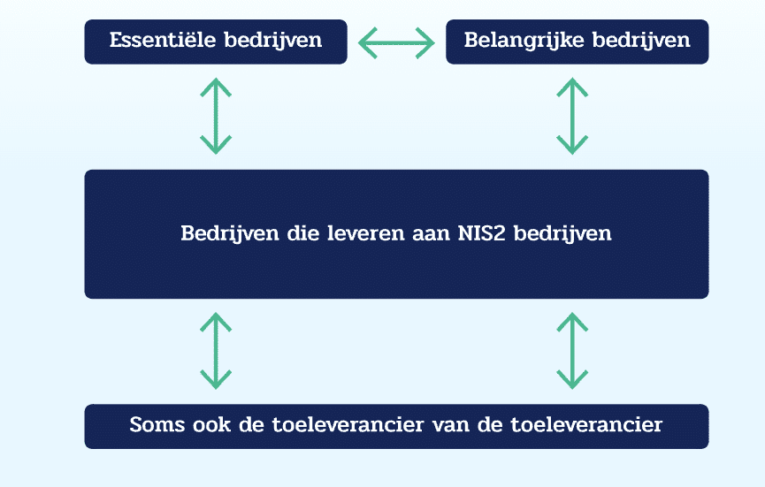 De nieuwe wetgeving vereist dat essentiële en belangrijke bedrijven op hoog niveau beveiligingsmaatregelen treffen om zichzelf te beschermen tegen cyberaanvallen. Echter, de NIS2 wetgeving gaat nog een stap verder door de invoering van de ketenzorgplicht.