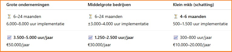 Voor grote en middelgrote organisaties kan het traject 6 tot 24 maanden duren. Dit komt door de omvang van de organisatie, de complexiteit van processen en het aantal ketenpartners. Voor het klein mkb ligt de implementatietijd meestal tussen de 4 en 6 maanden.